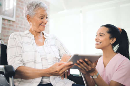 Guided recovery. a young nurse sharing information from her digital tablet with an older woman in a wheelchair.