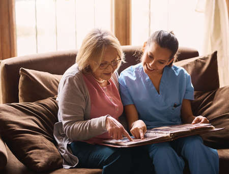 Triggering some old memories. a nurse and a senior woman looking at a photo album together.