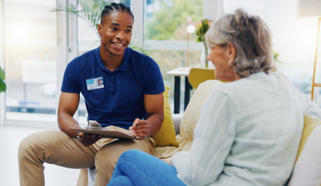 Retirement, paperwork and a nurse talking to an old woman patient about healthcare in an assisted living facility. Medical, planning and communication with a black man consulting a senior in her home
