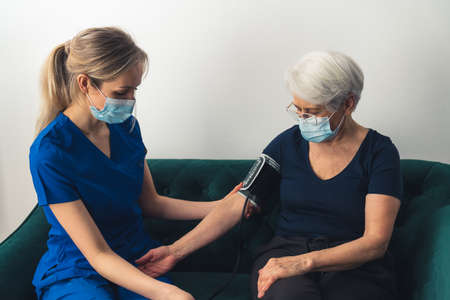 Masked caucasian doctor helps out her patient during home visit. Healthcare concept. High quality photo