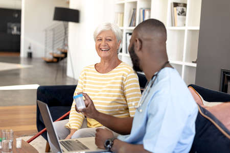 Male health worker with laptop discussing with caucasian senior woman over medication dose. Medical care and retirement senior lifestyle concept
