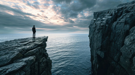 Figure on a cliff overlooking waves in a gloomy, mysterious, and atmospheric landscape. Lone figure standing on a cliff edge facing a dark, misty sea