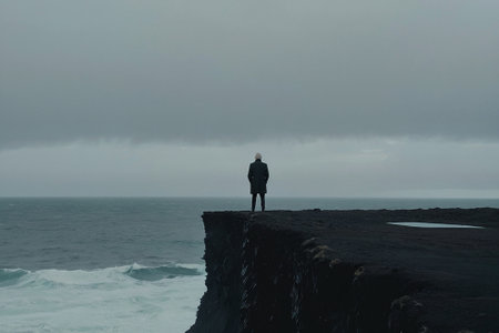 Figure on a cliff overlooking waves in a gloomy, mysterious, and atmospheric landscape. Lone figure standing on a cliff edge facing a dark, misty sea