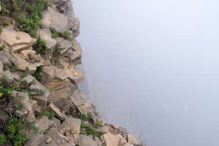 A solitary figure stands at the edge of a rocky cliff, shrouded in a dense, enveloping mist. The monochromatic palette emphasizes texture and depth, with the rugged surface contrasting with the soft, ethereal fog. This atmospheric scene evokes contemplation and can be used for projects related to solitude and adventure.