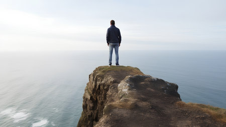 Image of a man standing on the precipice of a towering cliff, gazing downwards, symbolizing acrophobia