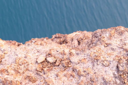 the photo showcases stunning cliffs along the shore, with the vast ocean just beyond. inspired by the style of beeple, it features an earth tone color palette and photorealistic details. the image exudes an austere simplicity, incorporating historical imagery. the light orange and dark cyan hues enhance the calm and serene beauty of the scene. ai generated