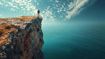 A traveler in a red jacket stands at the cliff's edge, gazing into the serene expanse of ocean. The atmosphere is peaceful yet awe-inspiring, creating a sense of adventure and reflection.