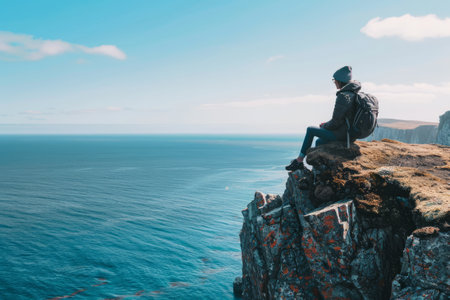 Traveler sitting on a cliff and look at the ocean. Travel and active life concept. Generative AI illustration