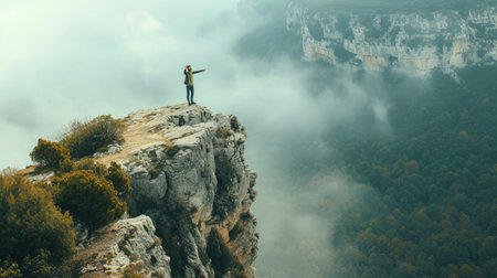 A solitary figure stands at the edge of a rocky cliff, silhouetted against a backdrop of dense fog. The image displays a minimalist composition with muted tones. It highlights the vastness of the environment. Suitable for conceptual illustrations or designs related to adventure and exploration.