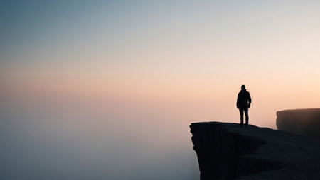 Person on cliff edge, silhouette style, misty background, concept of solitude