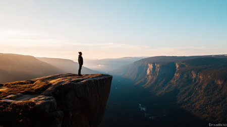 AI Generated. Silhouette of a person standing on a cliff edge at sunrise