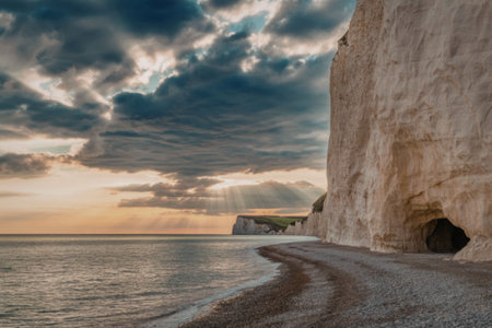 Beautiful seascape with cliffs and ocean waves at sunset.