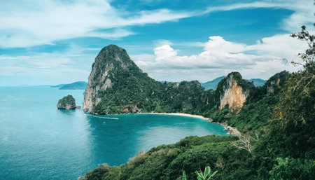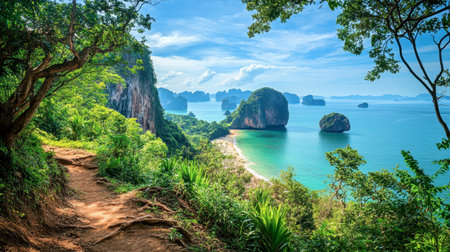 A breathtaking view of Phang Nga's coastline from a hiking trail, with lush greenery and dramatic cliffs creating a stunning backdrop.