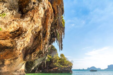 Cliff and the clear sea with a boat near Phi Phi island in south of Thailand
