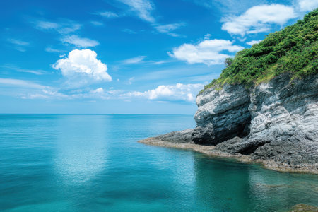 Tranquil seascape with rocky cliff and lush greenery under blue sky.