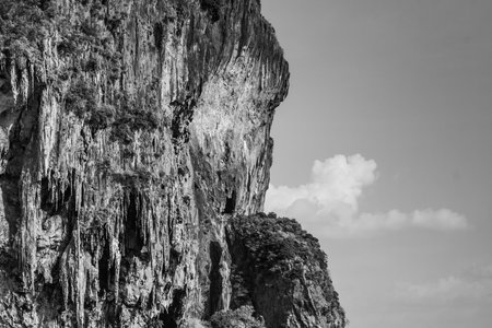 Scenic view of the cliff in Railay beach, Krabi, Thailand. Black and white picture.
