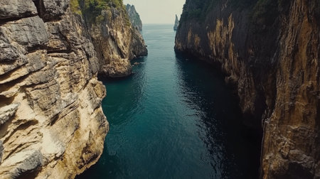 This photo captures an aerial perspective of the expansive ocean meeting tall cliffs in a breathtaking landscape, A panoramic aerial capture of a blue ocean and a rugged cliff, AI Generated
