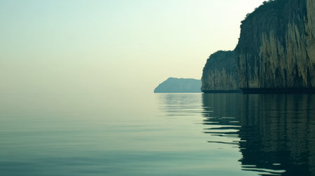 This striking image showcases a tranquil water surface reflecting majestic cliffs. The serene atmosphere invites calmness and a connection with nature.
