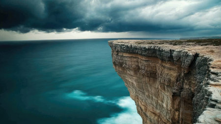 AI Generated. Dramatic Steep Cliff Overlooking Turquoise Ocean Under Dark Clouds