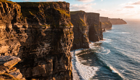 Cliffs rise dramatically above the ocean at the stunning coastline, showcasing the beauty of nature at sunset near the cliffs of Moher