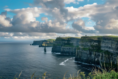 A scenic view showcases towering cliffs extending into the vast ocean under a dynamic sky filled with puffy clouds. The cliff tops are covered in green vegetation, adding to the landscapes allure.