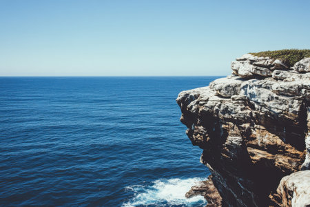 A rocky cliff overlooks the ocean. The water is calm and the sky is clear. The scene is serene and peaceful