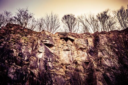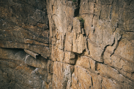 Natural background. Closeup edged shabby cliff cracks. Gray-brown stone rock texture of mountains. Vintage and faded matt style colour in tinted photo. Concept of geolog, mountaineering or hard work.