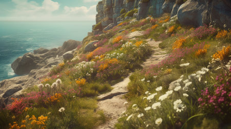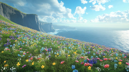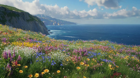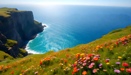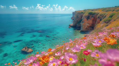 A breathtaking coastal landscape featuring vibrant wildflowers blooming on the cliffs, overlooking a vast blue ocean under a clear, sunny sky.