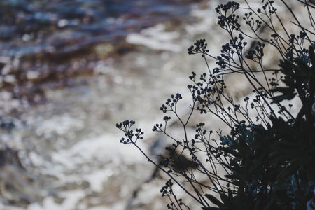 Silhouette of small flowers against the backdrop of the Mediterranean Sea, on the peninsula in southern France