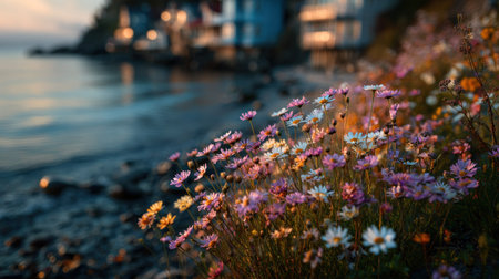 A cluster of delicate wildflowers in soft focus frames the foreground, with a body of water in the background. The image presents a gentle composition of natural elements, showcasing muted tones and warm lighting. Suitable for various creative projects and potential commercial applications, offering an evocative visual experience.