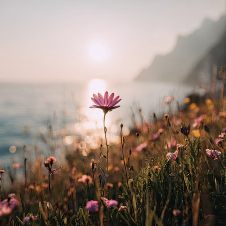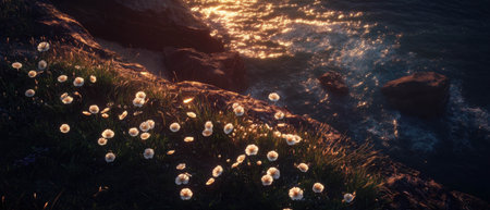 Wild daisies growing on a cliff overlooking the ocean at sunset create a picturesque landscape