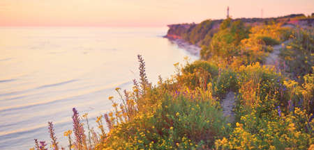 Beautiful panoramic view of wildflowers meadow and cliffs on the coast of Atlantic ocean at sunset
