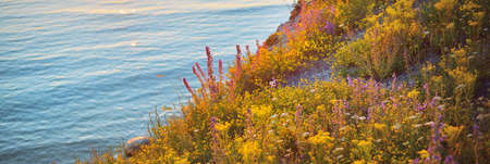 Panoramic view of the coast with flowers. Colorful spring landscape.