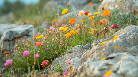 A beautiful scene showcasing colorful wildflowers blooming among stones, creating a vibrant contrast in a natural landscape. Perfect for nature lovers.