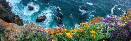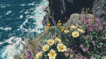 Brightly colored wildflowers decorate the rugged cliffside while waves crash against the rocks below, showing nature's beauty on a sunny day near the coastline.