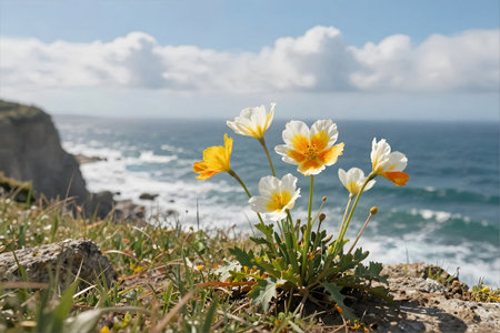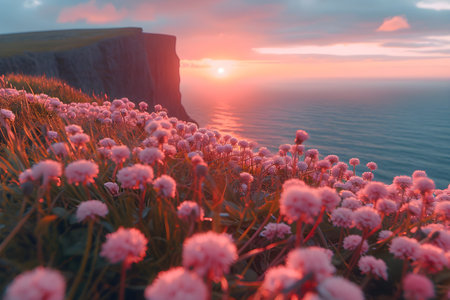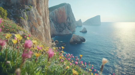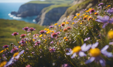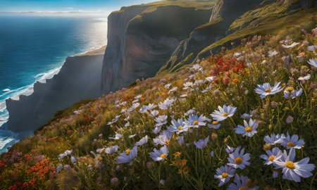Coastal cliff adorned with early blooming wildflowers under soft morning light