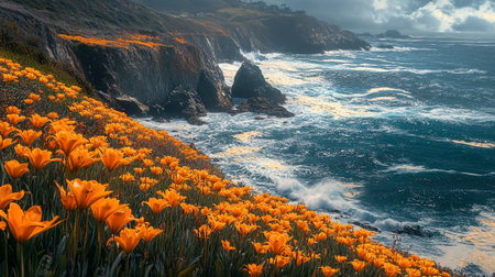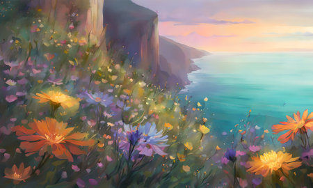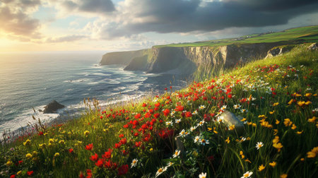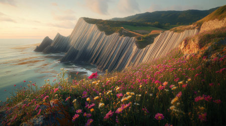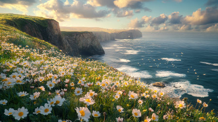 Coastal cliffs adorned with early blooming wildflowers under soft golden light