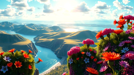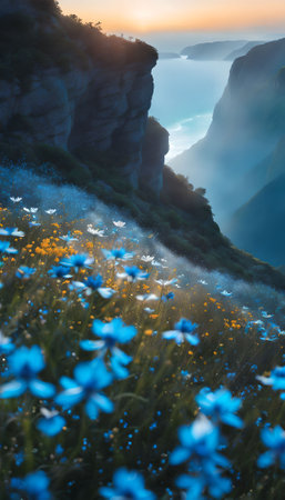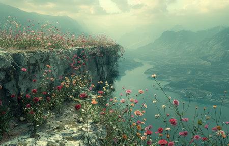 Beautiful mountain cliff adorned with vibrant wildflowers, overlooking a tranquil valley and river under a misty sky.