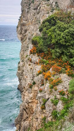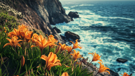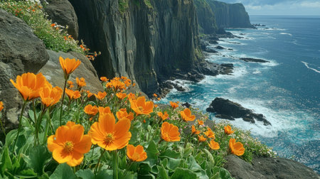 A breathtaking view of orange flowers blooming on cliffs above a turquoise ocean, showcasing the beauty of nature, dramatic landscapes, and vibrant colors near the coastline.