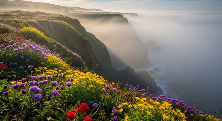 Breathtaking coastal cliffs are covered in colorful wildflowers and shrouded in morning mist, with sunlight breaking through the fog. The dramatic landscape features steep drop-offs into the ocean, highlighting the rugged beauty of nature.