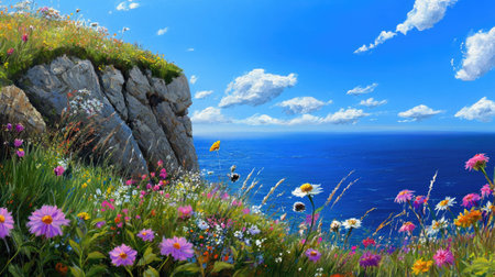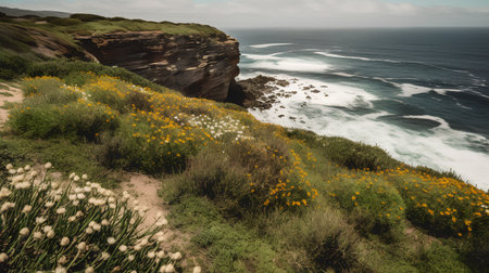 A breathtaking cliffside view of the ocean, waves crashing below, and wildflowers blooming in the warm sun.