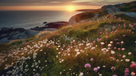 Golden hour illuminates the wildflowers blooming along the rugged coastal cliffs, creating a stunning natural tapestry against the backdrop of the setting sun over the ocean.