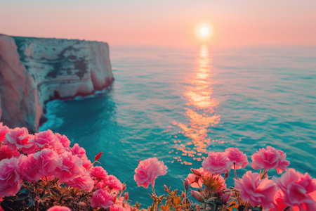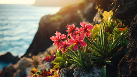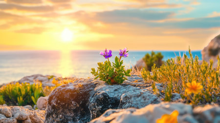 A stunning sunset over the ocean illuminates vibrant wildflowers on a rocky cliff. The scene captures nature's beauty and tranquility, inviting relaxation.