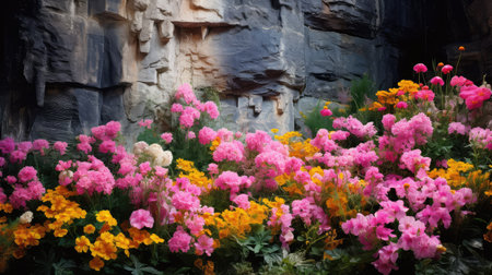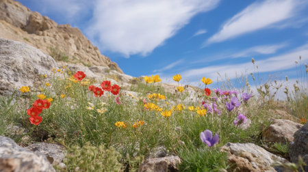 Desert Blossoms: Colorful Flowers in Rocky Landscape