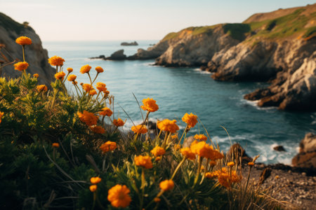 wild flowers bloom along the water, with the ocean as a backdrop. the vibrant colors of light orange and light cyan create a visually poetic scene. this photograph by marguerite blasingame captures the beauty of nature and evokes a sense of humanistic empathy. it is an inspirational image that embodies colorful dreams. ai generated