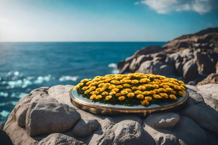 A landscape shot of a seashore with yellow flowers, rocks on a sunny day