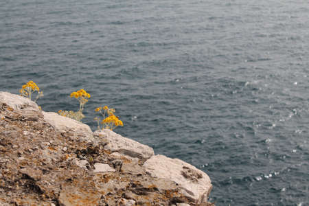 Coastline of the Atlantic Ocean with yellow and white crocuses