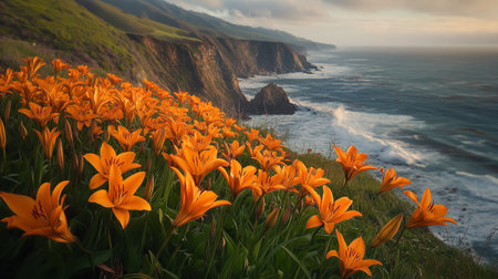 Orange lily flowers on the coast of Atlantic ocean. California, USA