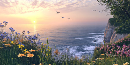 Peaceful coastal cliffs with wildflowers in bloom, overlooking the calm ocean. Birds soar in the sky above, and the waves gently crash against the rocks. The soft golden light of sunset adds a serene glow to the landscape.