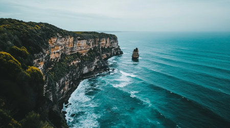 A stunning aerial view of a cliff by the ocean, where the fluid water meets the natural landscape, creating a picturesque and tranquil scene under the open sky AIG50